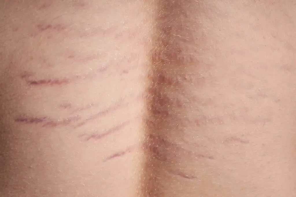 For instance, stretch marks caused by rapid weight gain or growth spurts can appear on areas such as the abdomen, thighs, buttocks, and arms. These stretch marks typically start off as pink or reddish streaks and may become lighter in color over time, but they may still retain a textured or indented appearance.